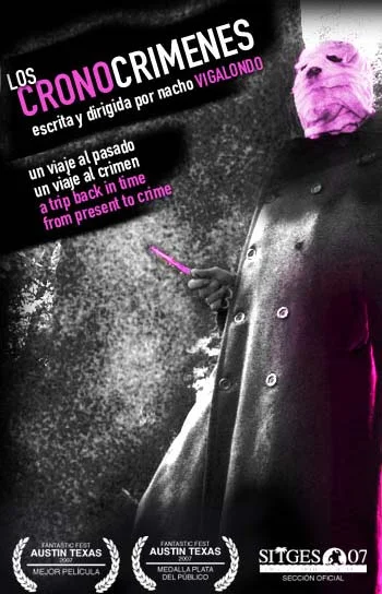 Original en extremo, austera, concisa, apelando a lo fantástico pero sin renunciar a la mundana crónica de lo terreno, Los cronocrímenes es un osadía en el cine español que, salvo excepciones, suele confiar en la inteligencia del espectador o en su falta absoluta de ella. Aquí triunfan tozudos ejercicios de malabarismos dramáticos con prosa espesa y vocación de tedio o de espasmo neuronal al tiempo que las taquillas y los videoclubs se abisman de naderías casposas que imitan (mal) las naderías de afuera. En mitad de este barullo inconcreto el genio patrio engendra obras de fuste, películas capaces de tumbar (en vigor, en belleza, en técnica) lo que admiramos extramuros. Salidos de Almodóvar o de Amenábar o de Díaz Yanes, que hacen caja y generan una genuina expectación en crítica y en espectadores, el cine español no se caracteriza por el atrevimiento inteligente. Los cronocrímenes abre, no obstante, caminos que no existían. No es una obra maestra, pero los mimbres de los que parte (su inefable adscripción a la serie B y su impecable registro de serie A) son voluntariamente modestos. Vigalondo, su empeño en conducir un primer largo diferente, busca complicidades más que adherencias. De hecho, la travesía del film, desde el trabajado blog a su formidable campaña de márketing, ha reclutado un público entusiasta, frikis y no-frikis, gente exigente y cinéfilos casuales, que han disfrutado con las aventuras de la momia rosa, las líneas temporales y los giros argumentales de Los cronocrímenes como en los lectores de literatura fantástica han disfrutado de Philip K. Dick, Welles, Matheson o el mismísmo Asimov.Desprovista de imprudentes golpes de efecto, se autocomplace en negar cientifismos, argumentos que expliquen lo que no se precisa, y se confía a la eficacia del guión, que no chirría, y eso en estas materias de conjeturas temporales, iteraciones y paradojas cuánticas es de agradecer. Lo que a Vigalondo le interesa es que el puzzle narrativo no pierda ninguna ficha en el trayecto que va de la escena primera a la última, que son (curiosamente) casi idénticas y ahí consigue méritos para esperar de su ingenio obras de más calado en el futuro. Sale uno del cine (en este caso de mi butacón con orejas en el salón familiar vía DVD) con la sensación de que le falta contundencia, pero por otra parte no sabríamos si ese plus de espectáculo puramente visual hubiese lastrado su modestia perfecta, su impecable sentido pop.